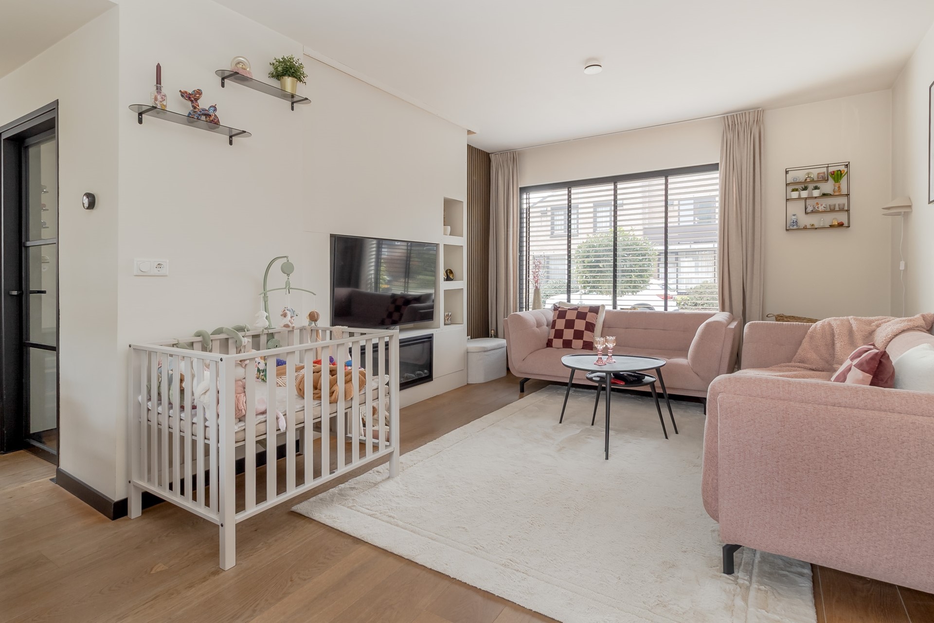 • L-vormige woonkamer (circa 33 m2) voorzien van een eikenhouten plankenvloer en fraaie cinewall. Een grote raampartij aan de voorzijde, voorzien van zonwering, zorgt voor veel lichtinval. Aan de achterzijde zorgen openslaande tuindeuren voor optimaal tuincontact.