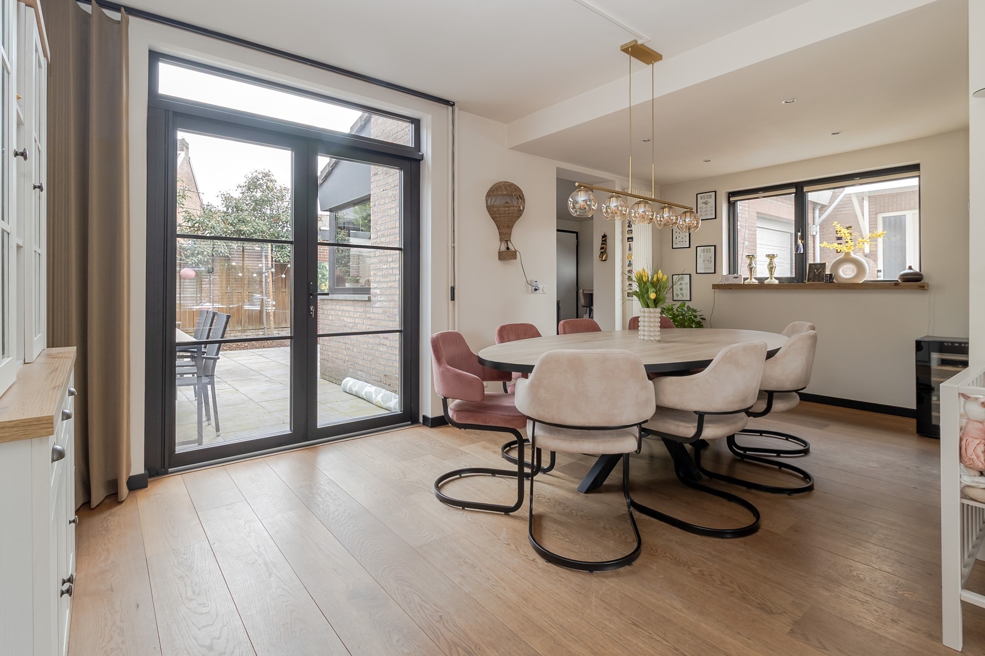 • Semi-open keuken (circa 10,5 m2) voorzien van een tegelvloer en een keukeninstallatie in hoekopstelling m.o.m. een inductiekookplaat, afzuigkap, oven, vaatwasser, koelkast en handige apothekerskast. Een grote raampartij zorgt voor veel lichtinval en tuincontact.
