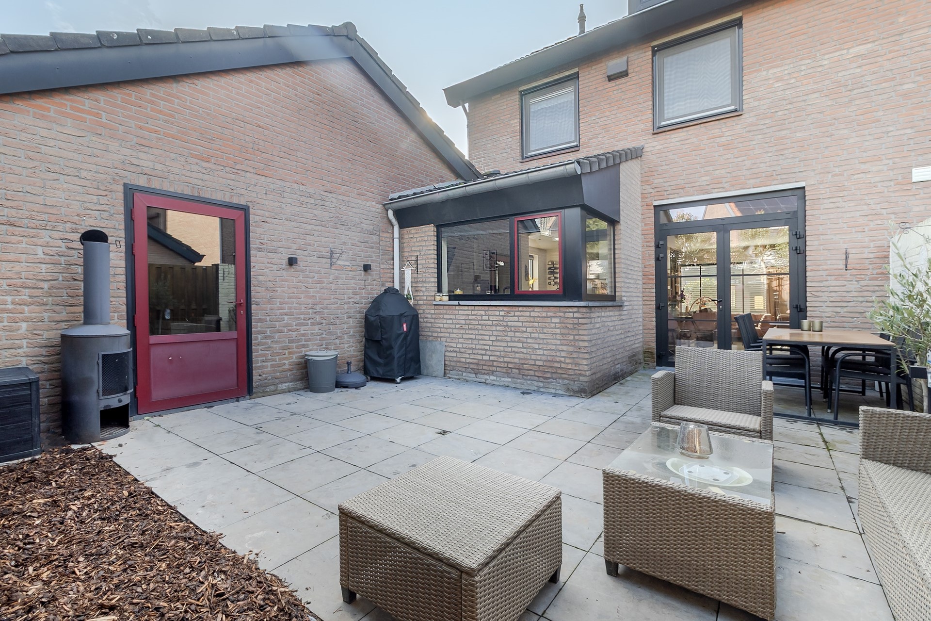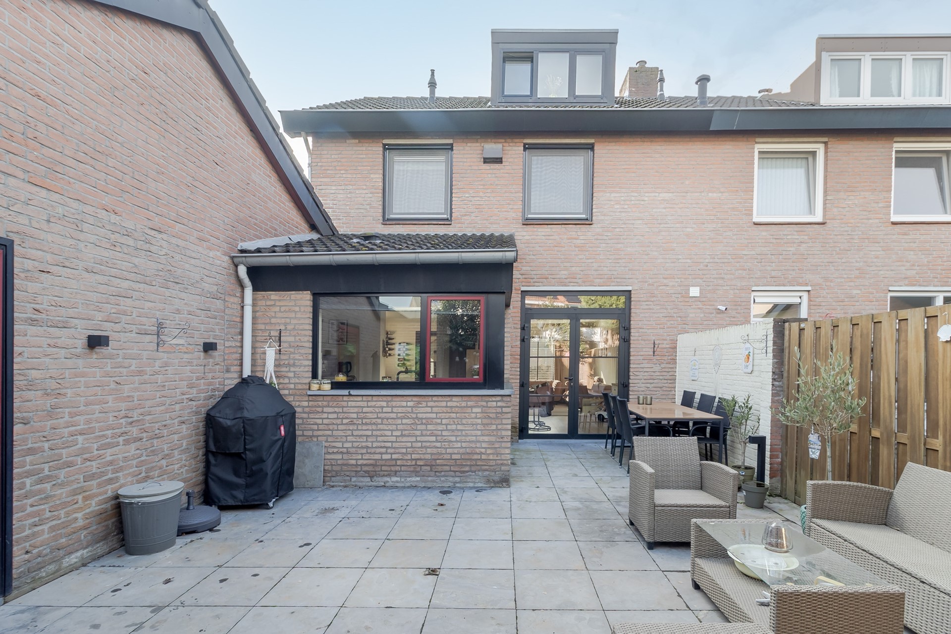 • De achtertuin is onderhoudsvriendelijk aangelegd en nagenoeg geheel betegeld. Leibomen zorgen voor wat groen en privacy. De tuin heeft een achterom via de berging.