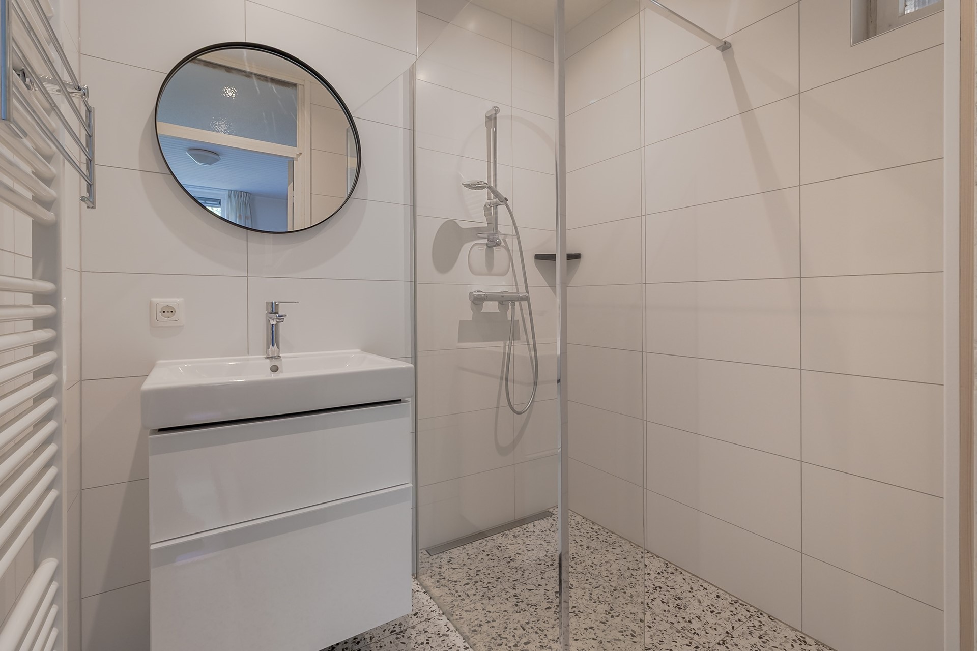 • Moderne badkamer en-suite (circa 3 m2), te bereiken vanuit de grote slaapkamer, voorzien van een inloopdouche, wastafel met onderkast en designradiator.