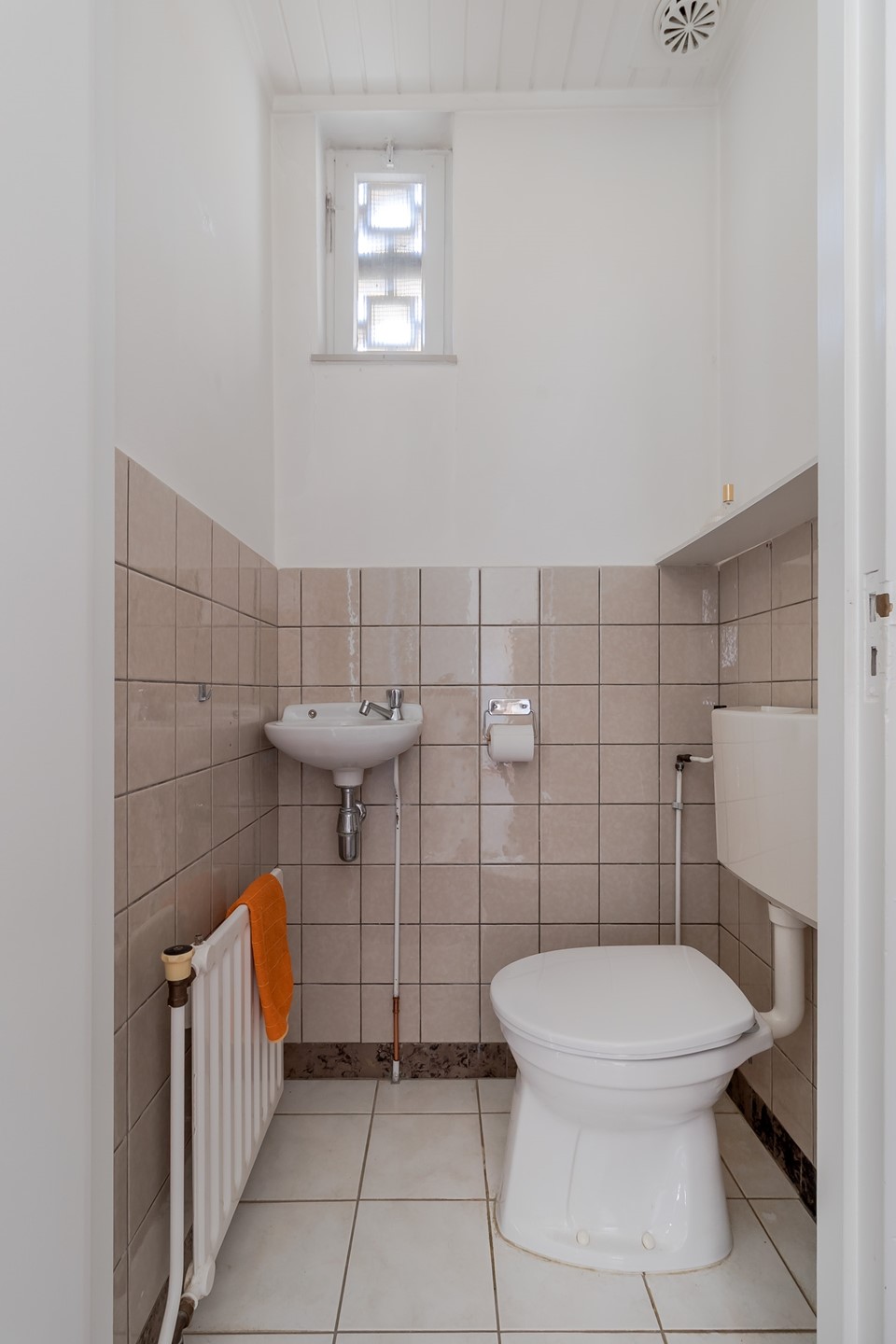 • Een portaal geeft vanuit de woonkamer toegang tot de deels betegelde toiletruimte met duoblok en fonteintje.